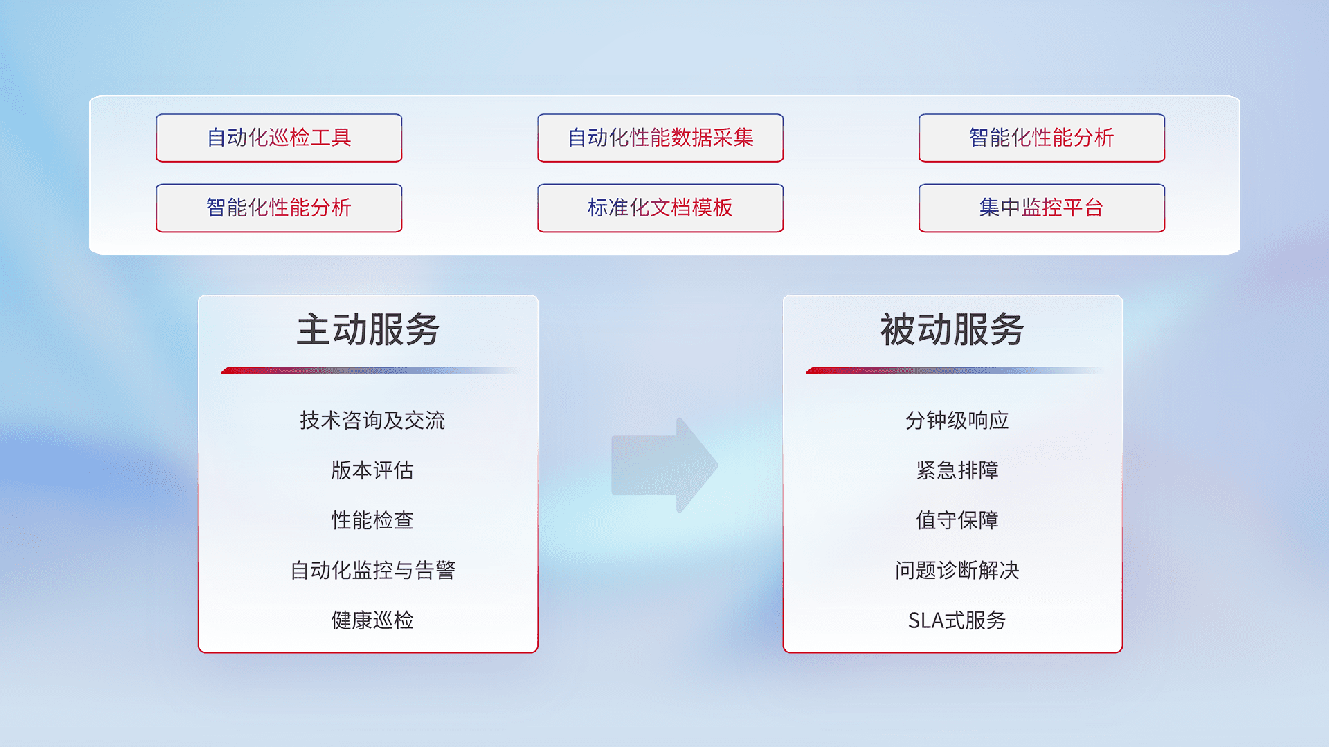 智能化工具和标准化文档,,,,保障服务质量,,提供主动服务(包含技术咨询、、、、版本评估、、、性能检查、、、自动化监控与告警、、、健康巡检)和被动服务包含(分钟级响应、、紧急排障、、、、值守保障、、、、问题诊断解决、、、、SLA服务)。。。